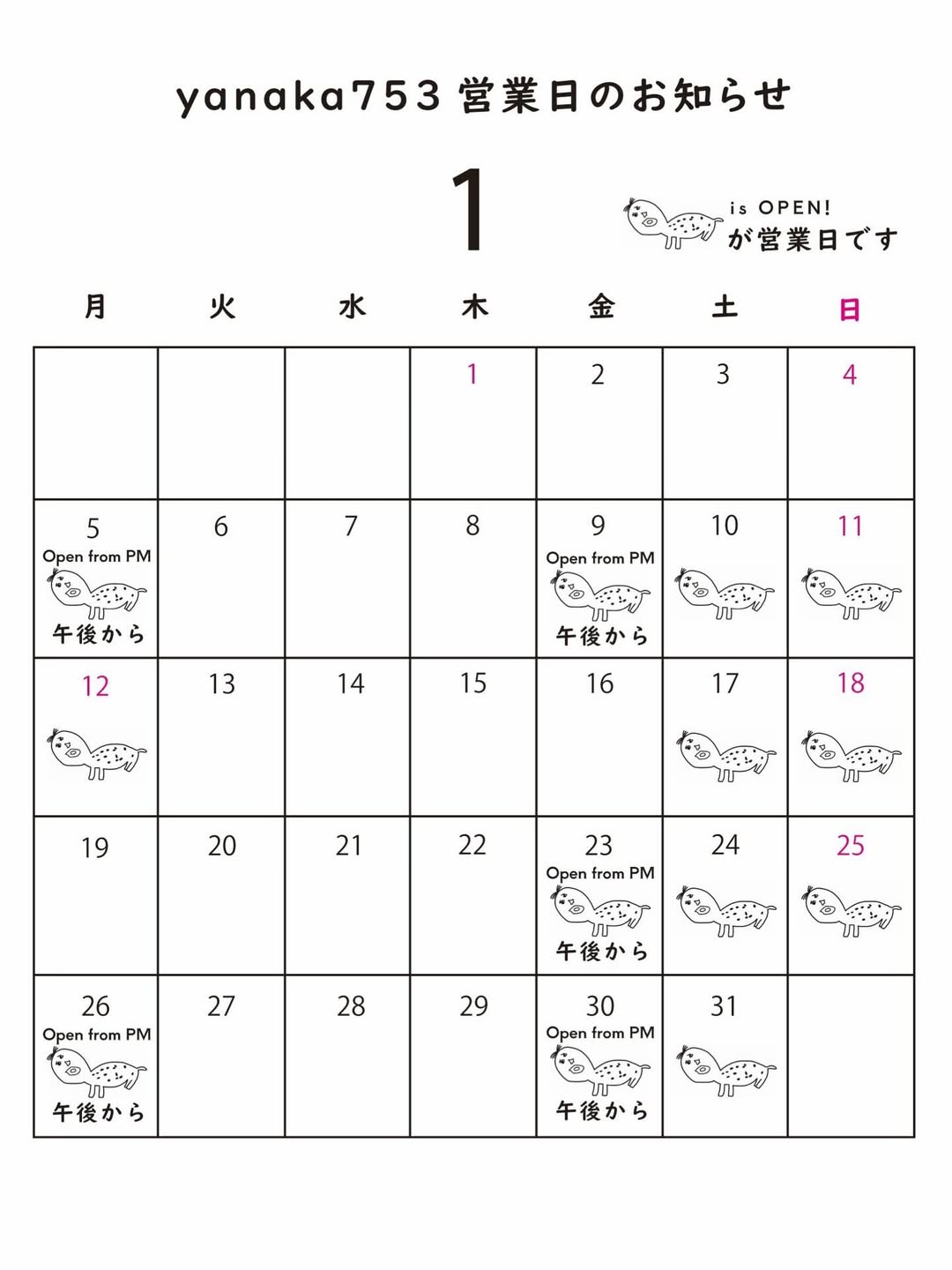 営業についてのお知らせ 2026-01-05 お知らせ 【1月の営業日のお知らせ】 いつもご利用頂き誠にありがとうございます。 本年の営業は28日で終了させて頂きました。 年末年始のお休みは 12/29(月)~1/4(日) です。 新年は1/5(月)午後から営業いたします。