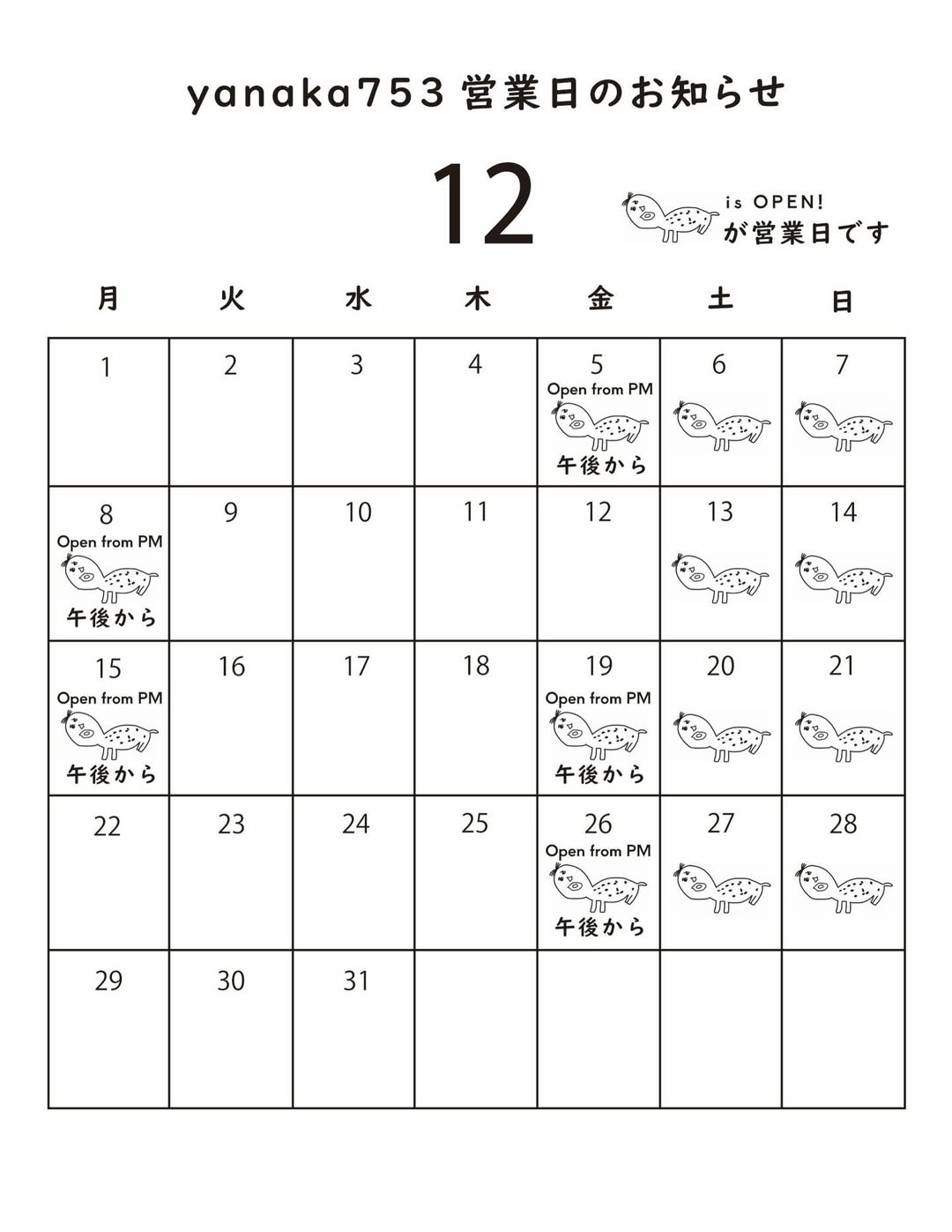 営業についてのお知らせ 2025-12-01 2025-12-02 お知らせ 【12月の営業日のお知らせ】 12月は変則的な営業日となります。 基本的に土日は営業、火〜木曜日はお休みです。 それ以外の曜日はカレンダーをご確認下さいませ。 年内は28日(日)までの営業とさせて頂きます。 みなさまのお越しを心よりお待ちしております。